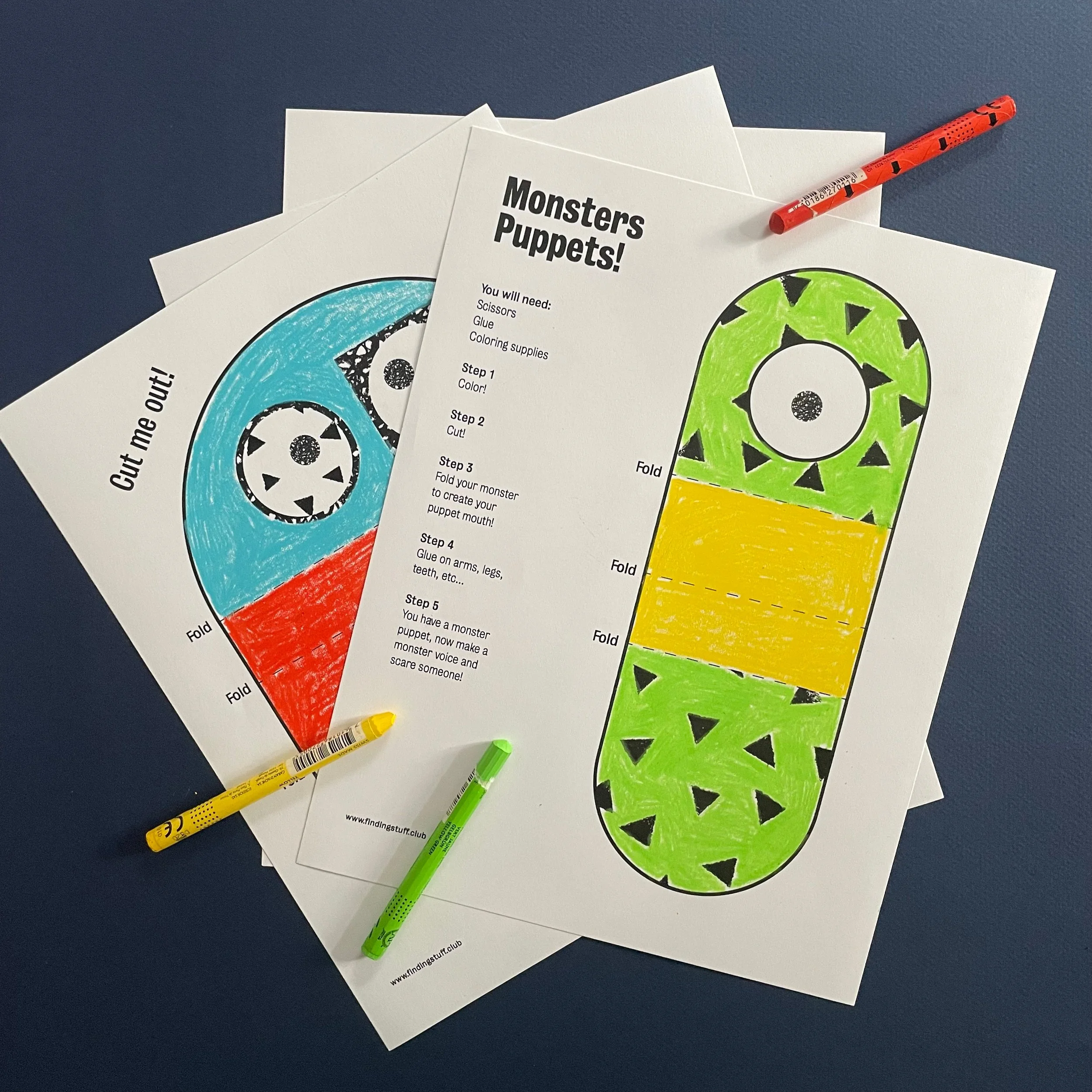 Monster Puppets! PrintablesScavenger HuntsFamily Activity Oct 27 Written By Meghan Eplett Spice up your Halloween with these two spooktacular friends. Get your monster voice ready to go — you’re gonna need it! Download & Print Meghan Eplett
